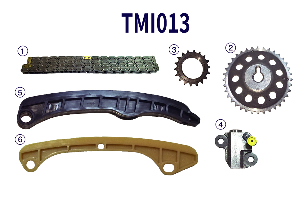 時規修理包 TIMING KIT TMI013-01 MN128497 TIMING CHAIN 122L TMI013-02 MR984193 CAM GEAR (2PCS) TMI013-03 MR984366 ONLY CRANK GEAR TMI013-04 MN128498 TENSIONER TMI013-05 MR984190 GUIDE RIGHT TMI013-06 MR984189 GUIDE LEFT