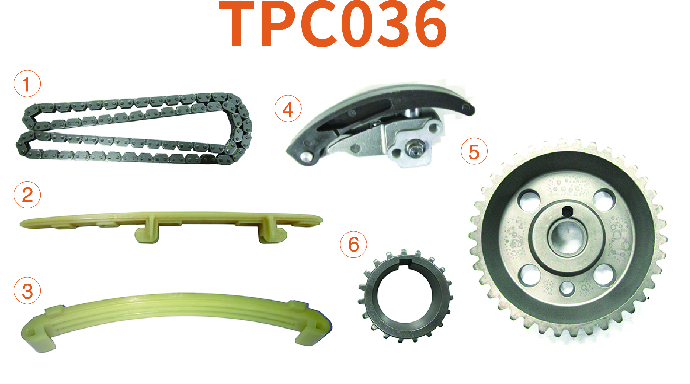 時規修理包 TIMING KIT TPC036-01 24572394 TIMING CHAIN 4x4x124L TPC036-02 24572016 GUIDE TPC036-03 24572049 GUIDE TPC036-04 24573179 TENSIONER TPC036-05 24570973 GEAR TPC036-06 24574600 GEAR