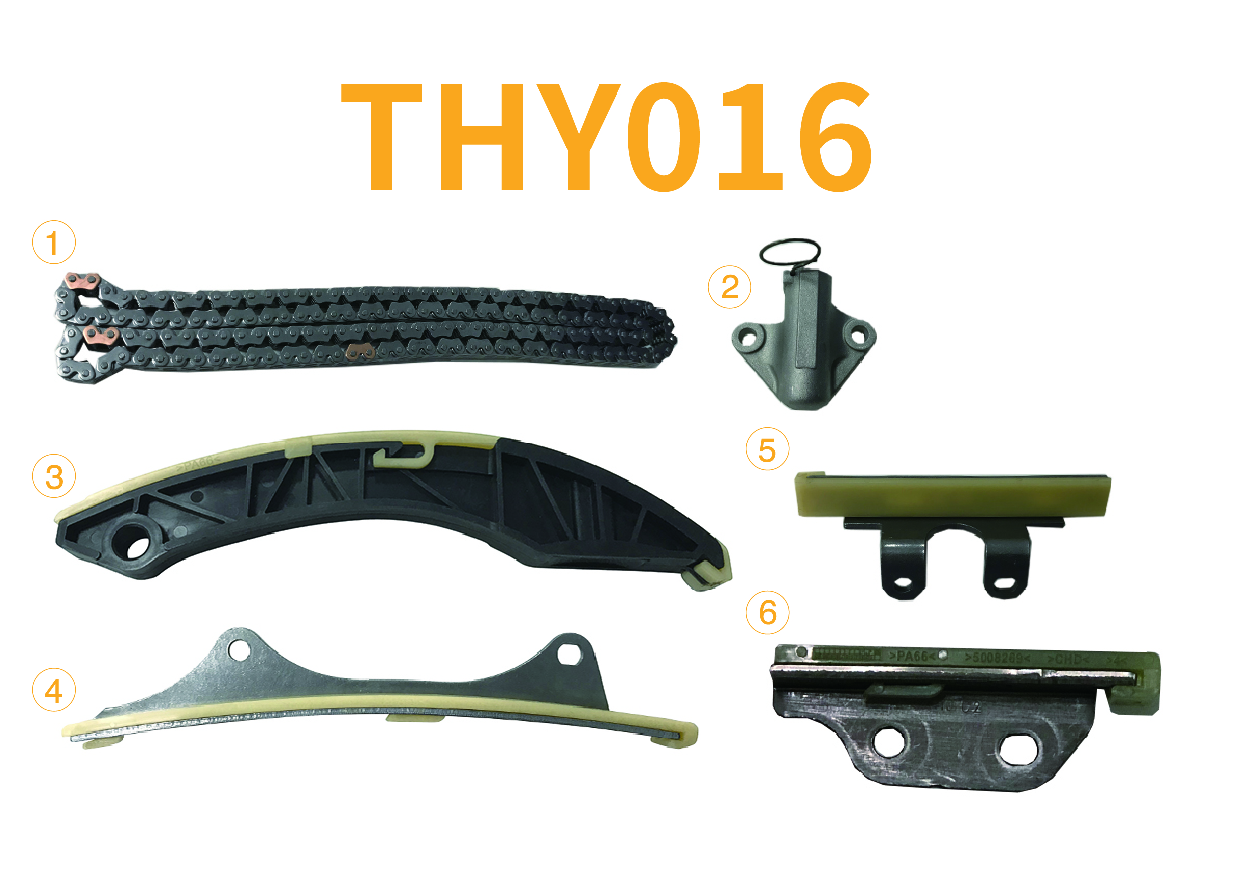 時規修理包 TIMING KIT THY016-01 24321-03000 TIMING CHAIN 4x5x160L THY016-02 24410-03000 TENSIONER THY016-03 24420-03000 GUIDE THY016-04 24431-03000 GUIDE THY016-05 24432-03000/10 GUIDE THY016-06 24433-03000 GUIDE