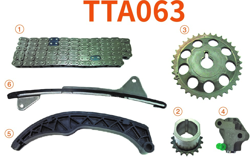 時規修理包 TIMING KIT TTA063-01 13506-47020 TIMING CHAIN 128L TTA063-02 13521-47010 GEAR TTA063-03 13523-22020 GEAR ( 2 PCS ) TTA063-04 13540-47030 TENSIONER TTA063-05 13591-0W010 GUIDE TTA063-06 13566-0W010 GUIDE